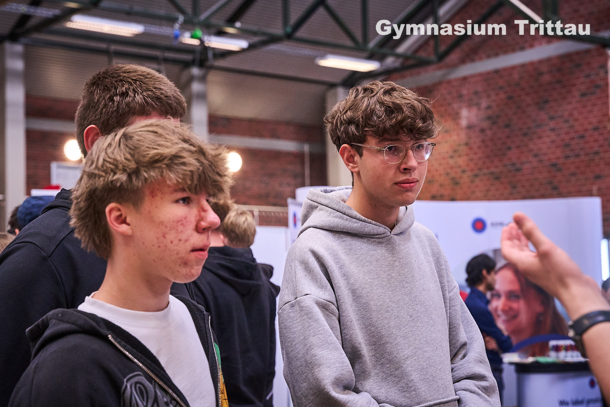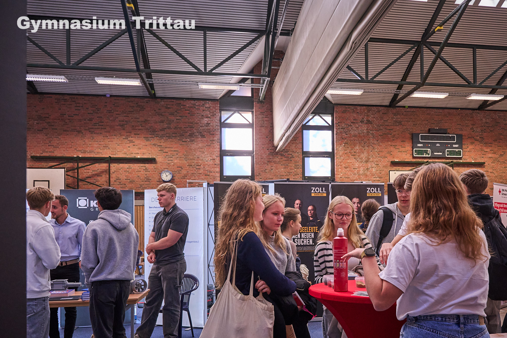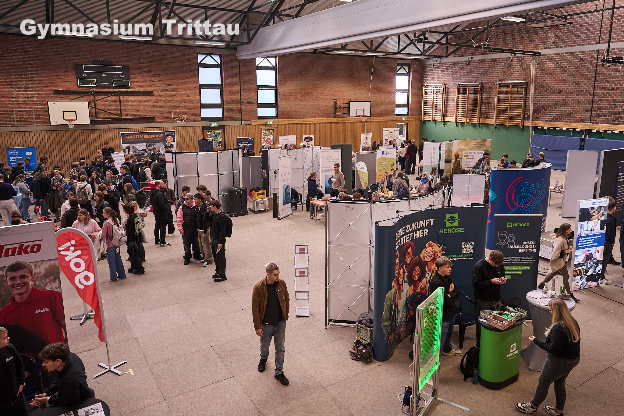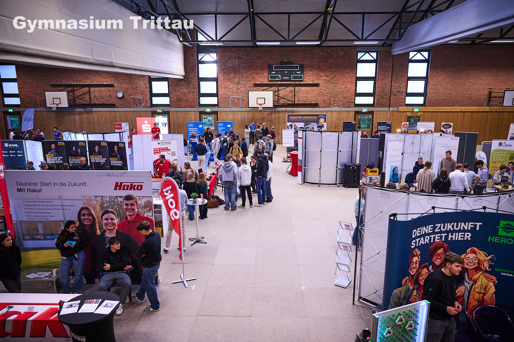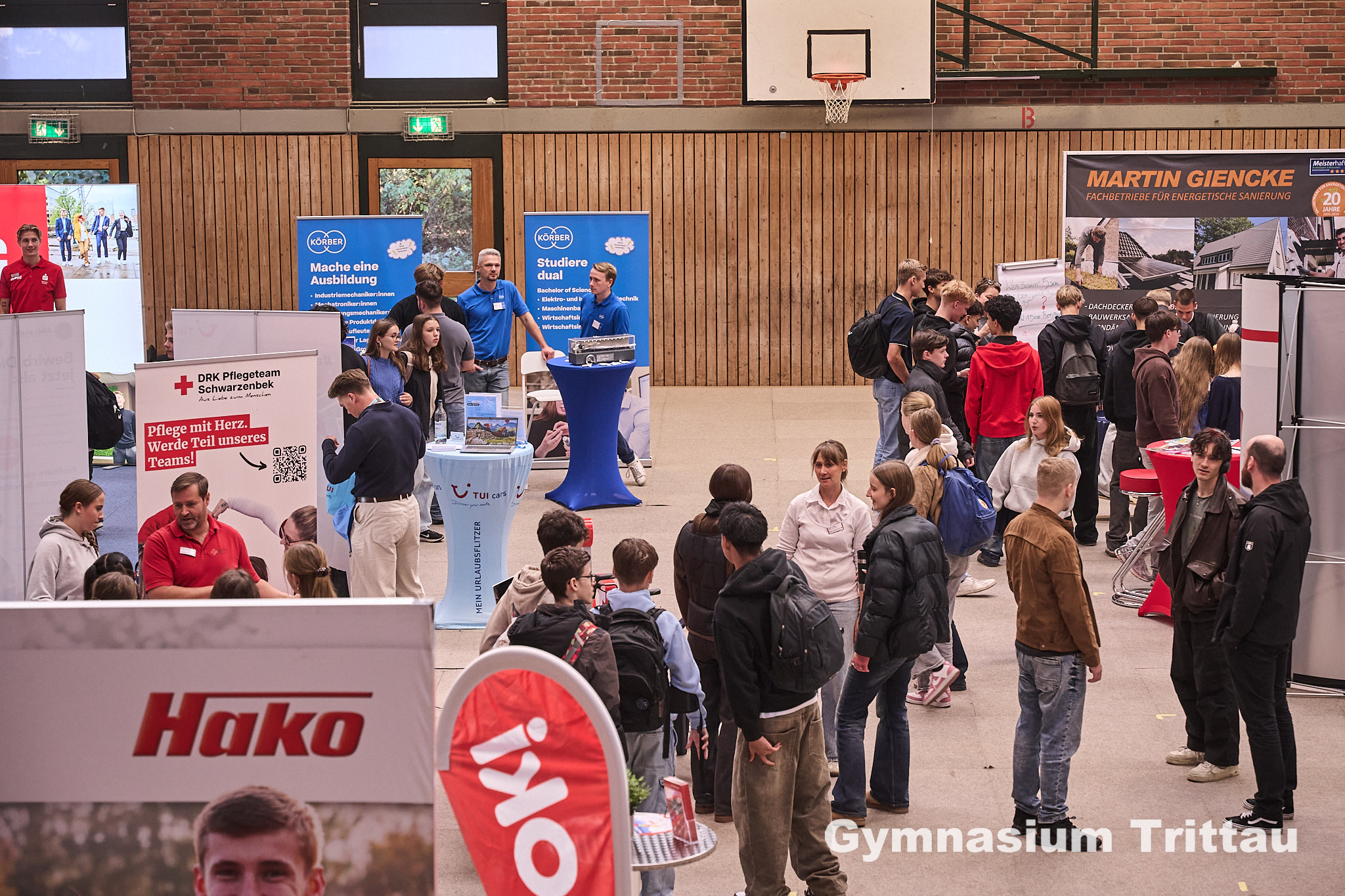 Am 01.10.2025 fand in der Sporthalle des Gymnasiums Trittau die dritte Jobmesse mit über 40 Ausstellern statt. Unter der Organisation von Frau Scharnberg und Frau Kattenberg, zwei sehr engagierten Elternteilen, zeigten Aussteller aus vielen Wirtschaftsbereichen unserer Schülerschaft ihre Ausbildungsangebote und Möglichkeiten eines Dualen Studiums auf.
