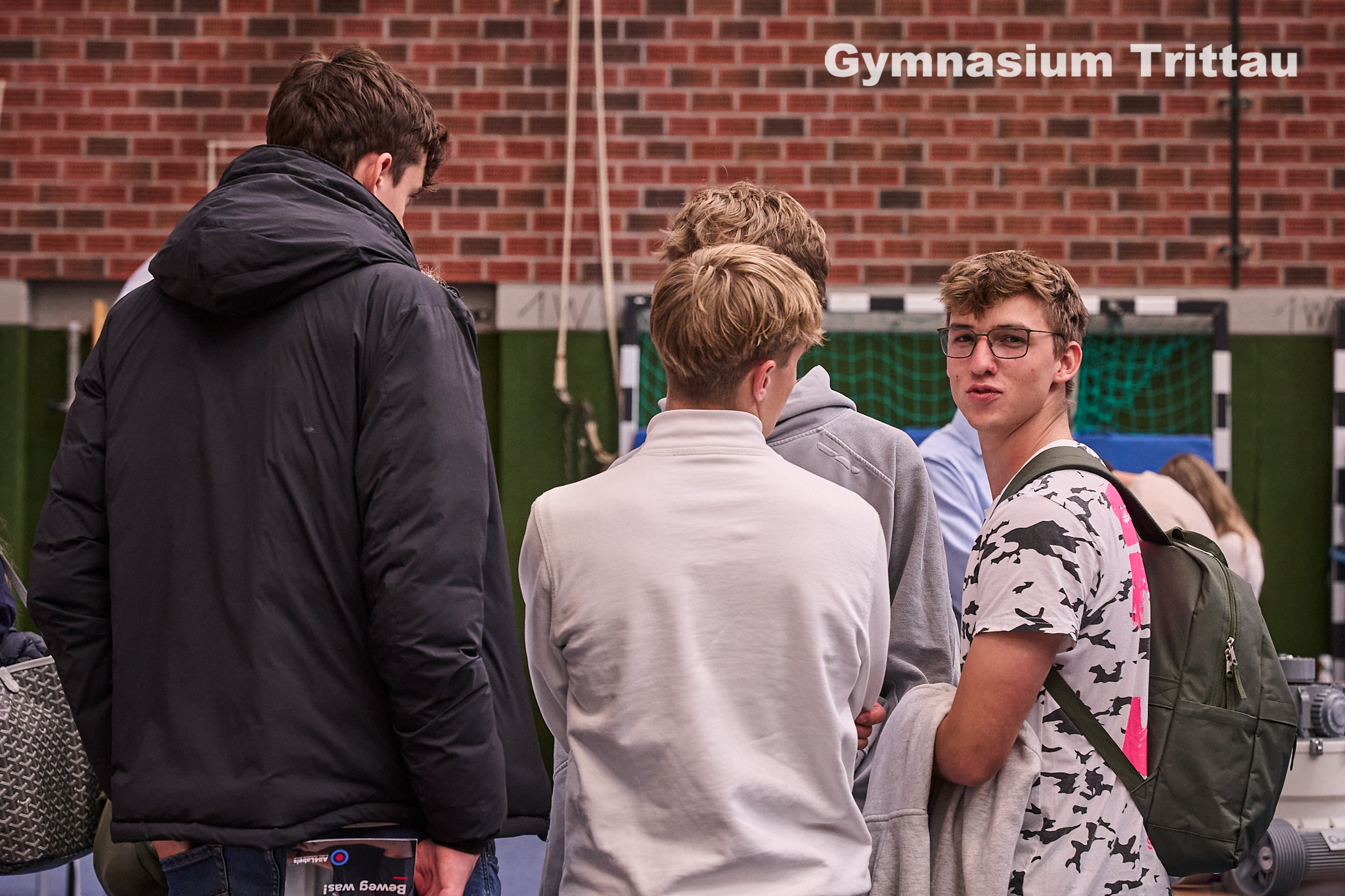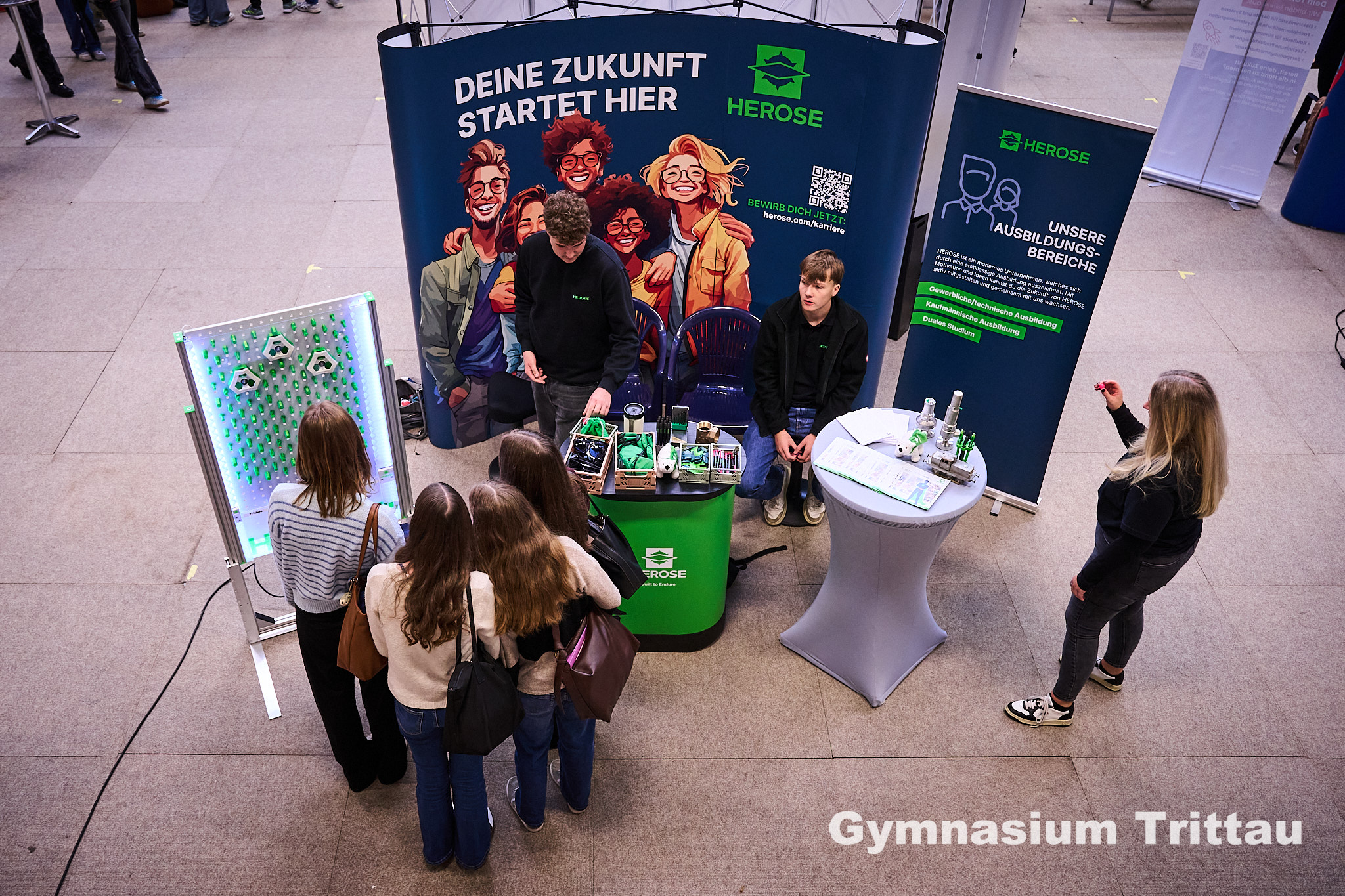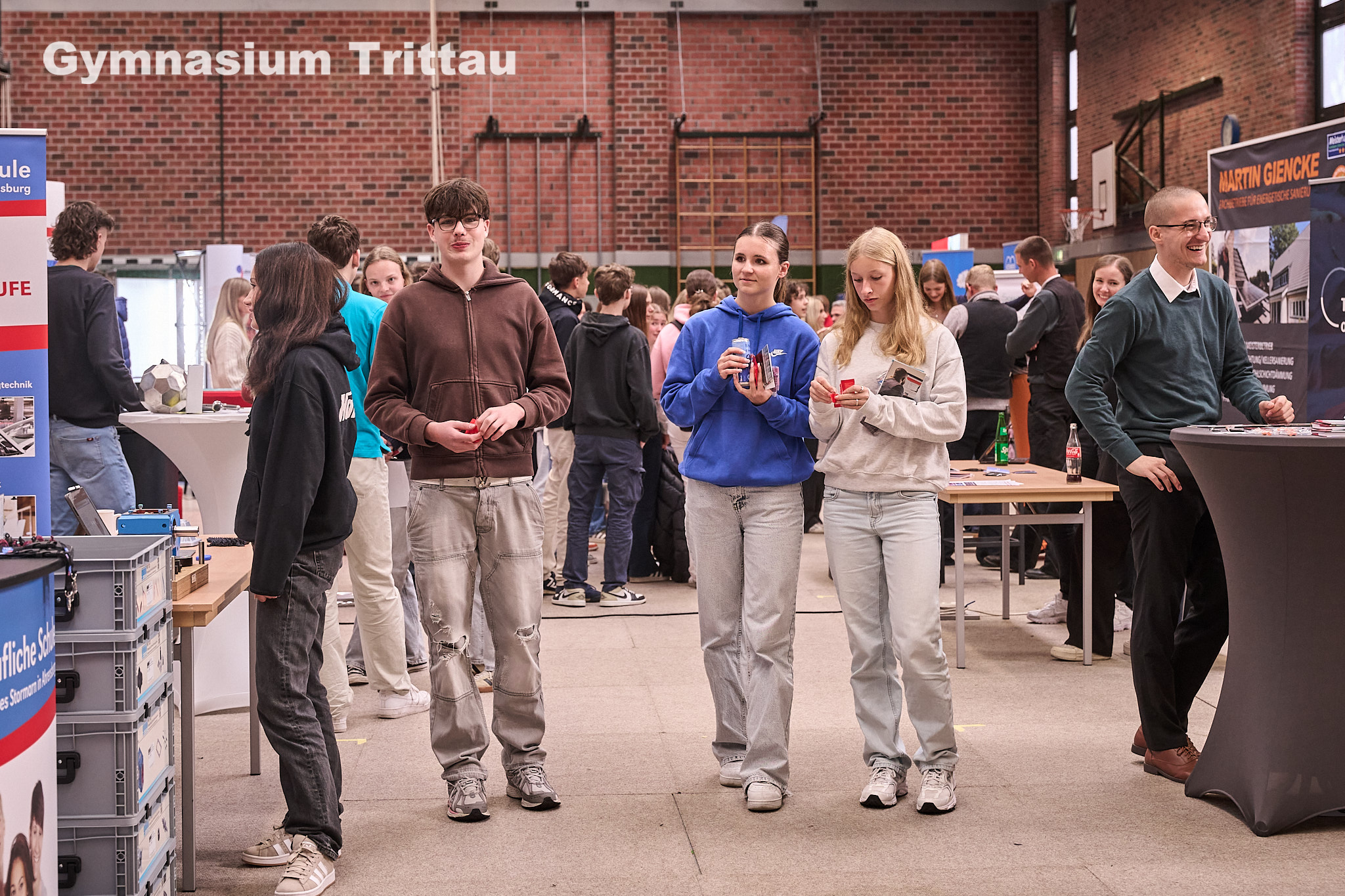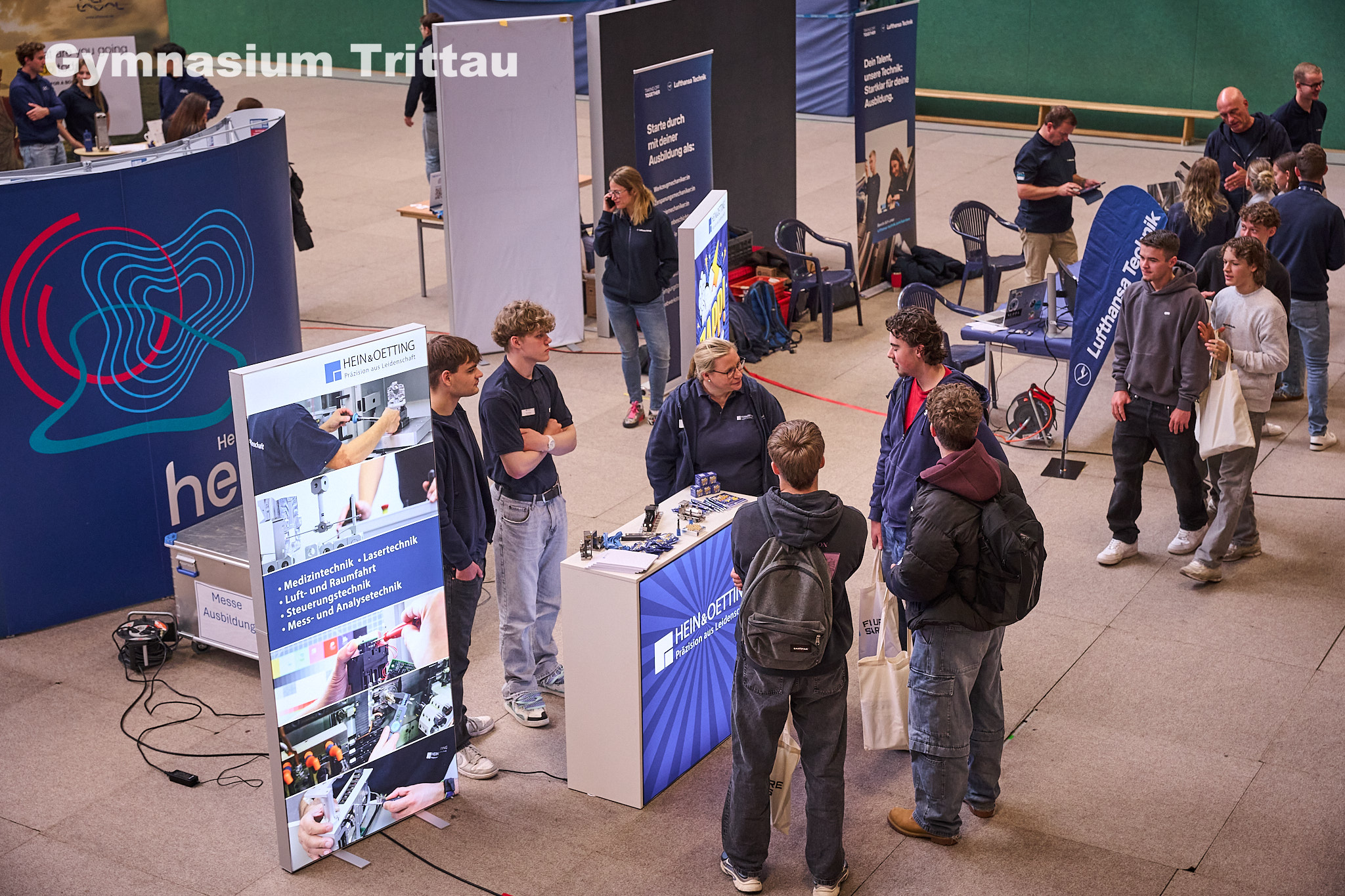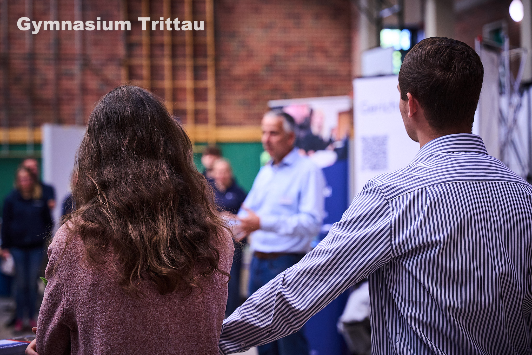Am 01.10.2025 fand in der Sporthalle des Gymnasiums Trittau die dritte Jobmesse mit über 40 Ausstellern statt. Unter der Organisation von Frau Scharnberg und Frau Kattenberg, zwei sehr engagierten Elternteilen, zeigten Aussteller aus vielen Wirtschaftsbereichen unserer Schülerschaft ihre Ausbildungsangebote und Möglichkeiten eines Dualen Studiums auf.