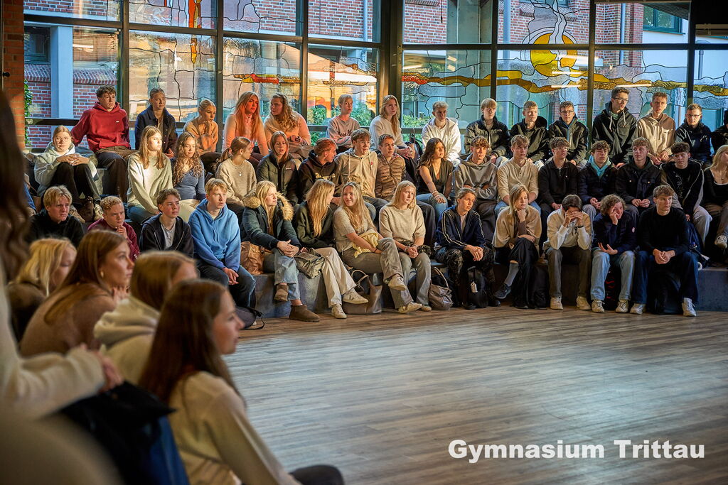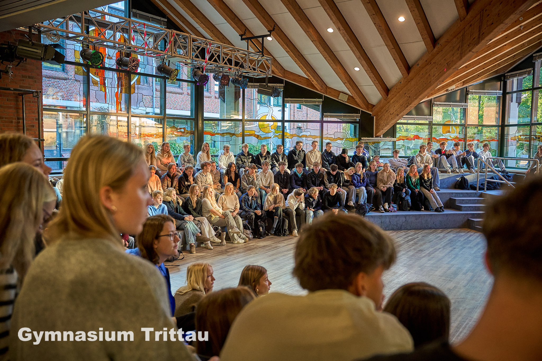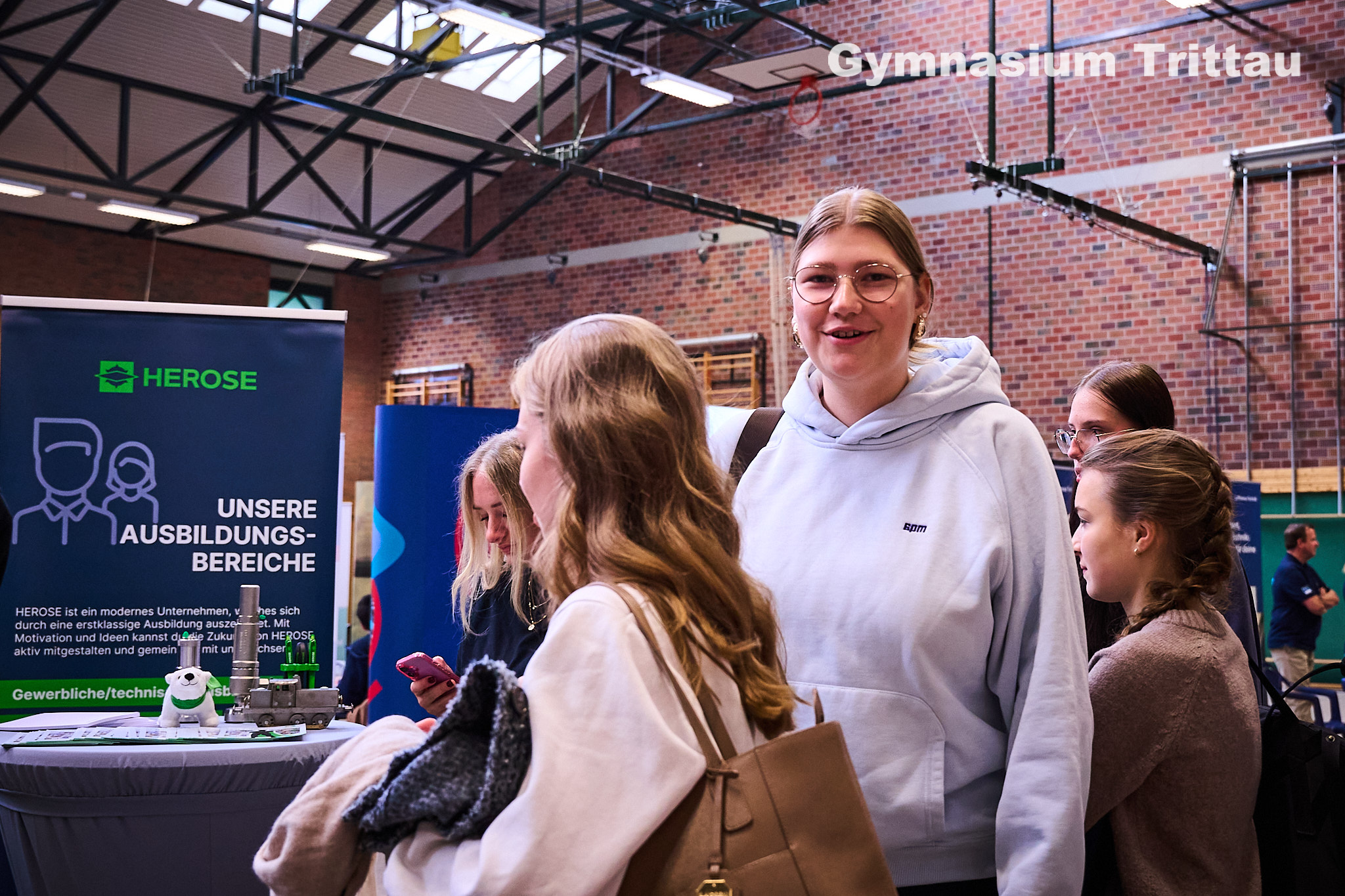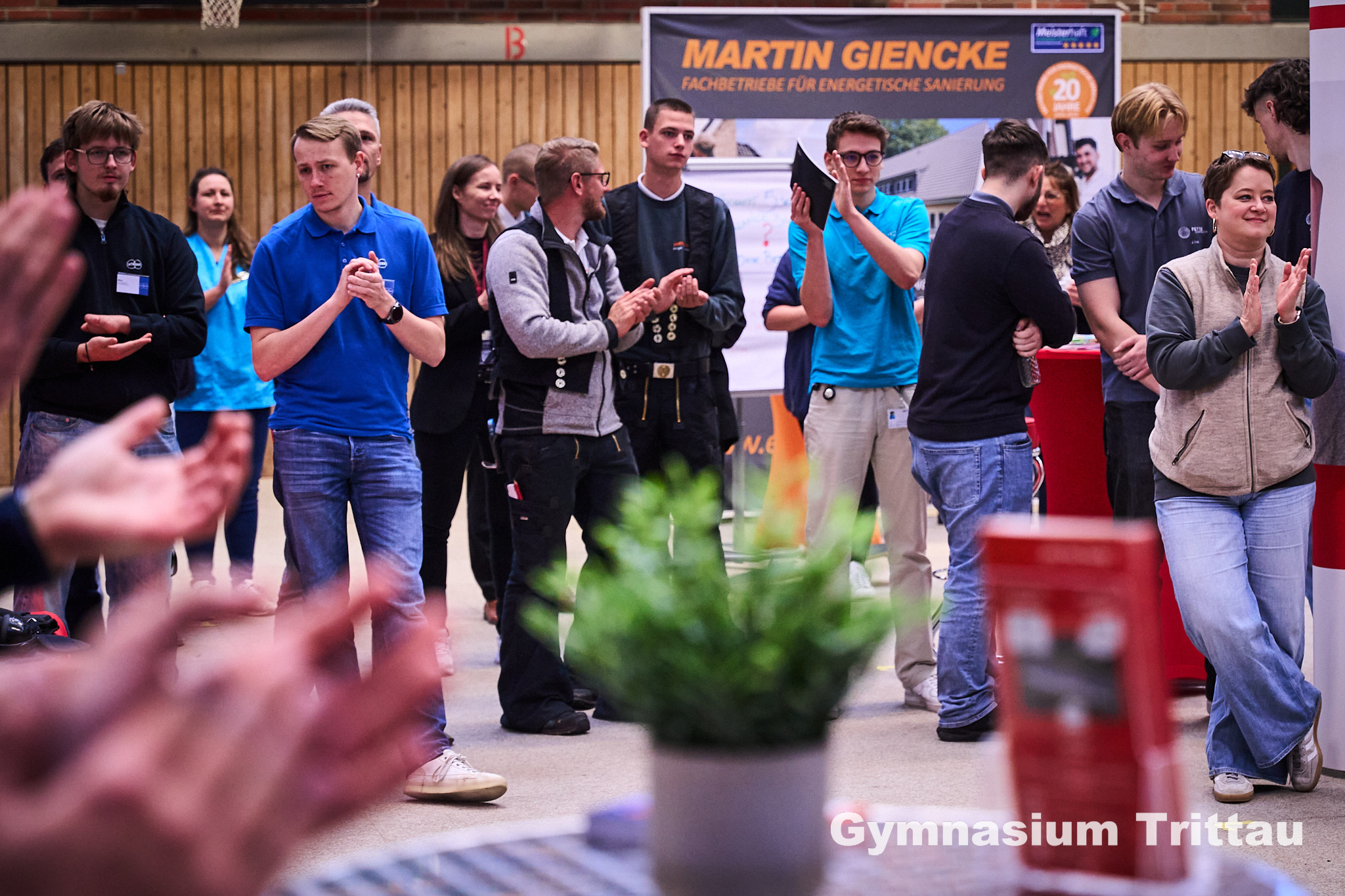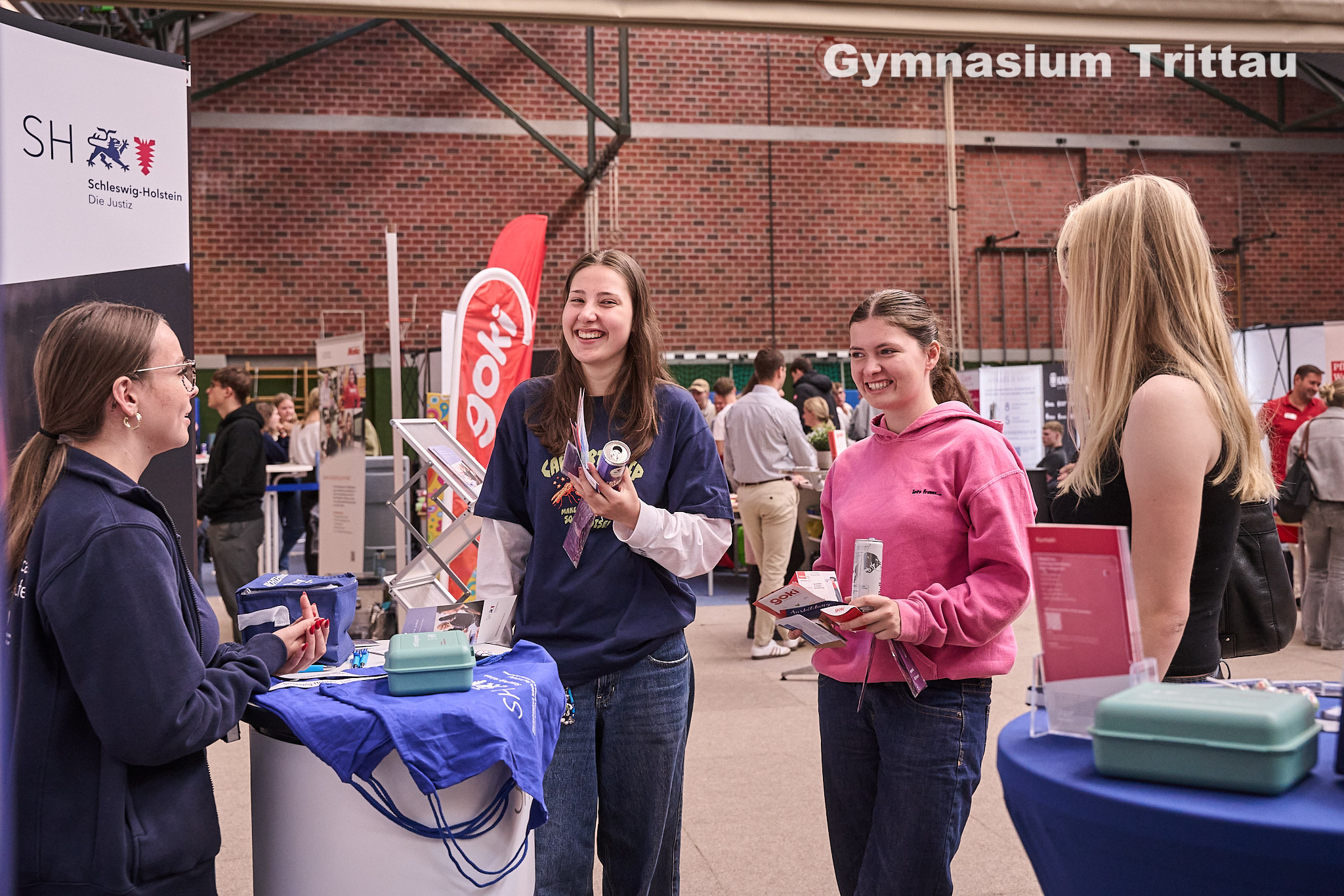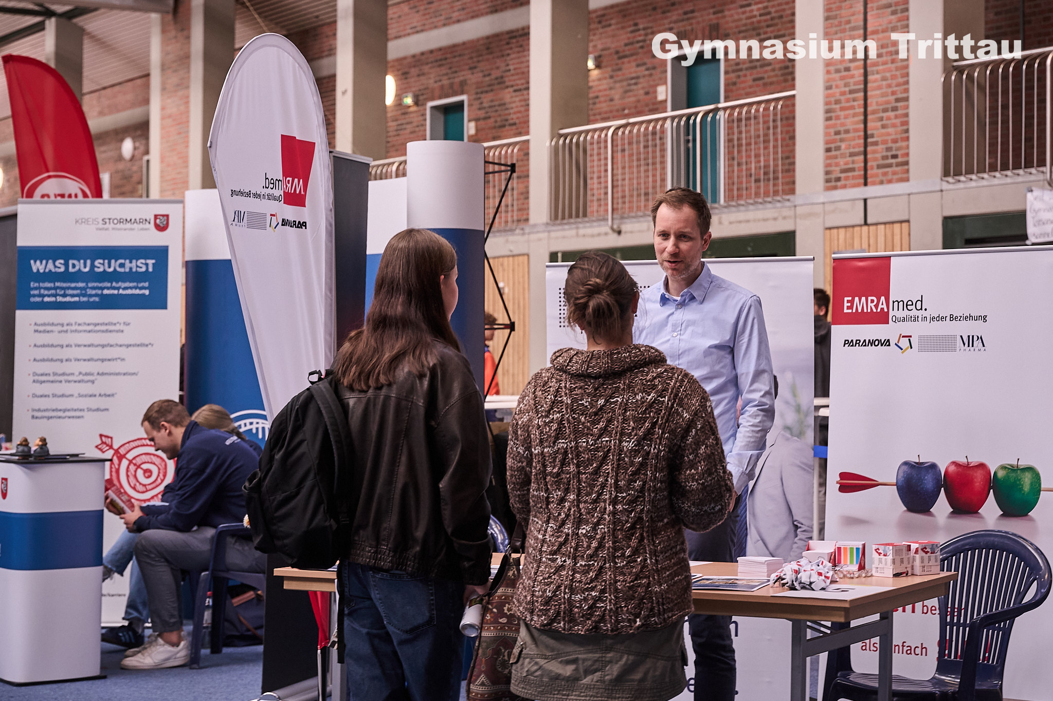 Am 01.10.2025 fand in der Sporthalle des Gymnasiums Trittau die dritte Jobmesse mit über 40 Ausstellern statt. Unter der Organisation von Frau Scharnberg und Frau Kattenberg, zwei sehr engagierten Elternteilen, zeigten Aussteller aus vielen Wirtschaftsbereichen unserer Schülerschaft ihre Ausbildungsangebote und Möglichkeiten eines Dualen Studiums auf.