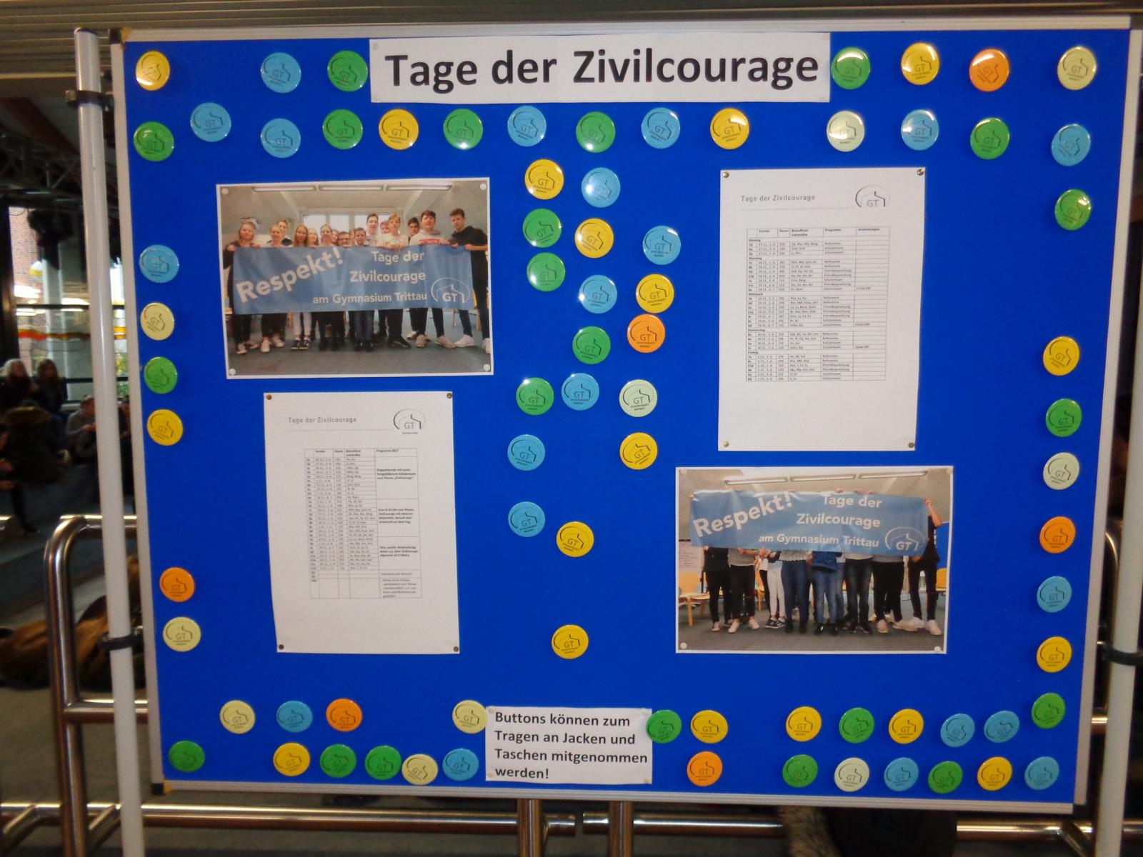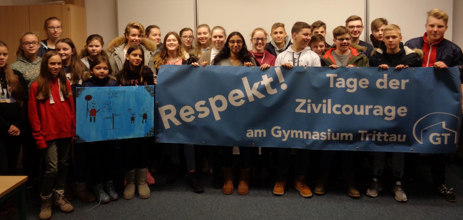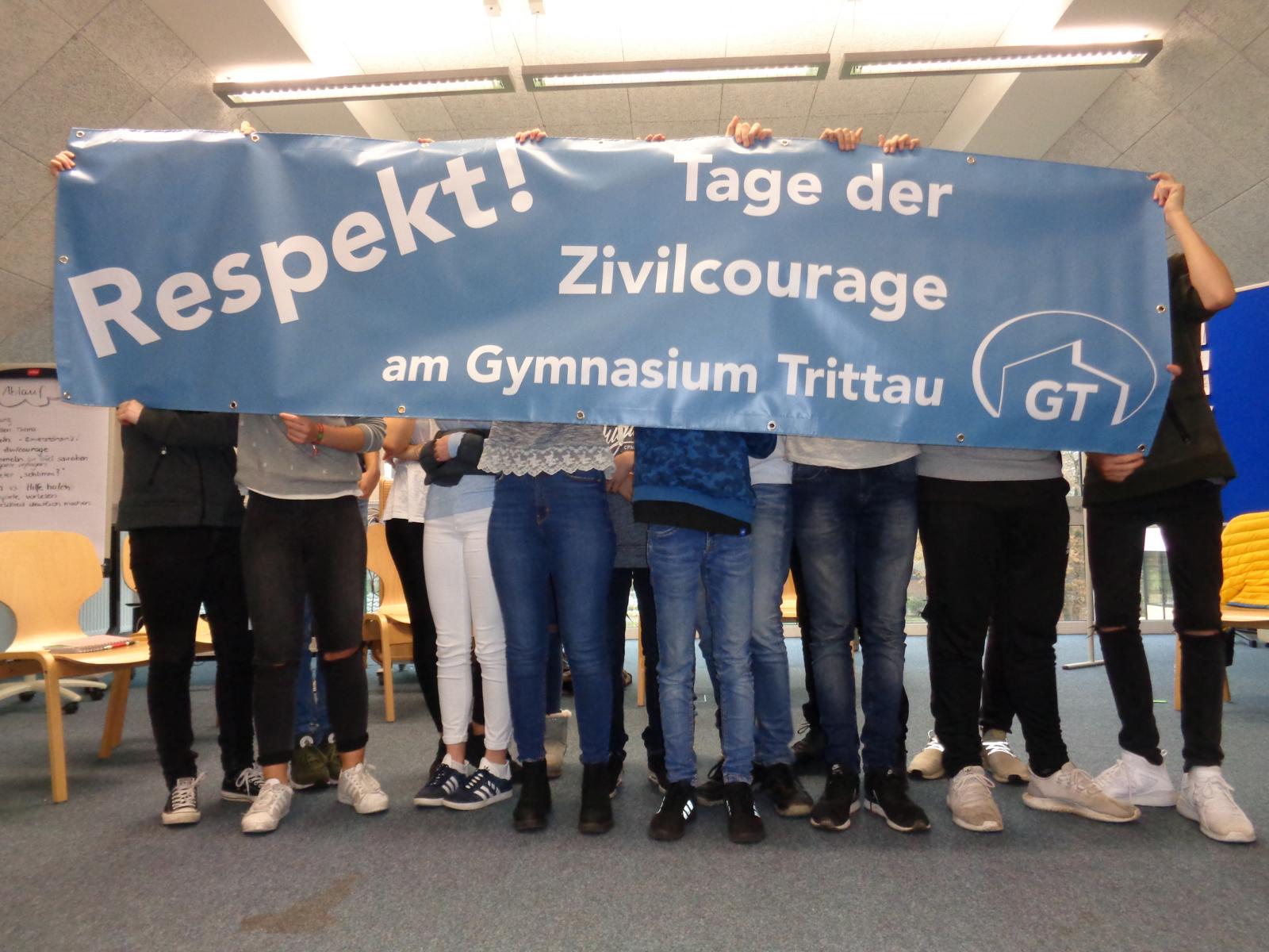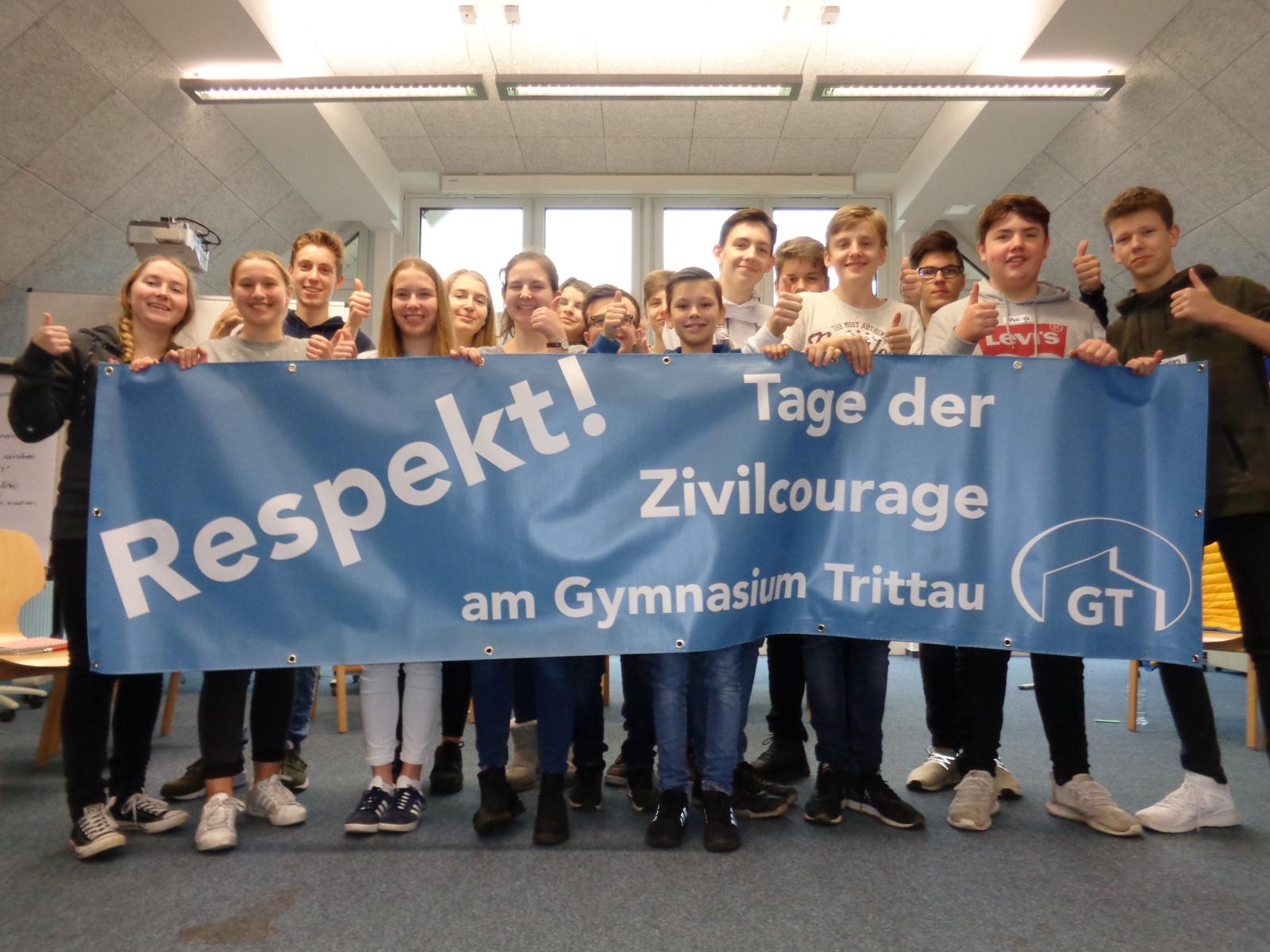 Das Gymnasium Trittau führt in der Zeit vom 27. November bis zum 1. Dezember 2017 (direkt vor dem Anti-Mobbing-Tag am 2.12.17) die „Tage der Zivilcourage“ durch. Ziel ist es dabei, (nicht nur) die Schülerschaft zum Nachdenken über das eigene, aber auch das Verhalten von anderen Personen anzuregen. Nahezu jede Klasse der Schule beschäftigte sich in dieser Woche zumindest ein paar Stunden eingehender mit dem Thema Zivilcourage, lediglich den mit den Klausuren und dem Abitur beschäftigten Q-Klassen ist die Teilnahme freigestellt. In den Jahrgängen 9 und 10 wird z.B. ein zuvor gemeinsam in der Klasse geschauter Film anschließend zusammen mit der Klassenleitung besprochen und dabei auch allgemein der Bezug zur Zivilcourage hergestellt. In den Jahrgängen 7 und 8 kommen externe Referentinnen zum Einsatz und gestalteten jeweils einen sechsstündigen Kurs zum Thema Zivilcourage.
