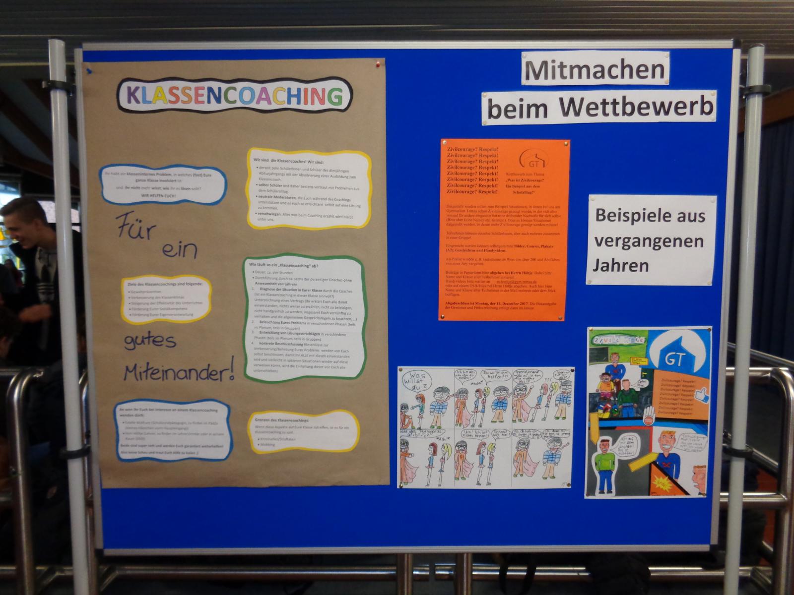 Zudem wird es einen Wettbewerb zum Thema „Was ist Zivilcourage? Ein Beispiel aus dem Schulalltag!“ geben. Dabei können Situationen als Bilder, Comics, Geschichten, Plakat oder Handyvideo dargestellt werden, in denen am Gymnasium Trittau schon Zivilcourage gezeigt wurde oder in denen mehr Zivilcourage gezeigt werden müsste. Die Preisverleihung wird dann im Januar erfolgen.
