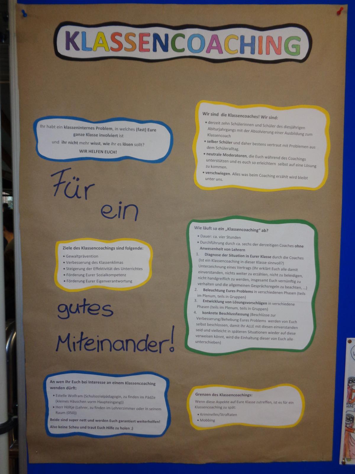Während der Woche werden sich weiterhin innerhalb des gesamten Schulgebäudes verteilte Plakate als „Denkanstöße“ befinden: Situationsbeschreibungen oder Fotos zum Thema Zivilcourage, die zum Nachdenken anregen sollen. Ziel ist es dabei auch, dass man aufeinander Acht gibt, nicht nur bzw. erst in auffälligen Situationen aktiv wird, sondern sich auch um seine Mitmenschen in schwierigen Phasen kümmert.