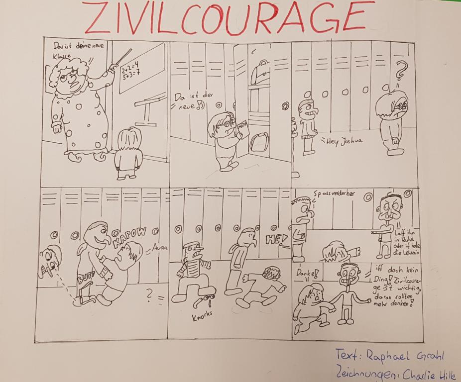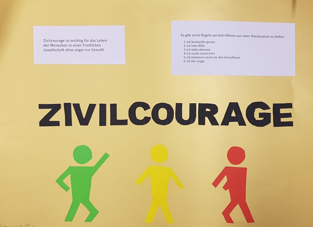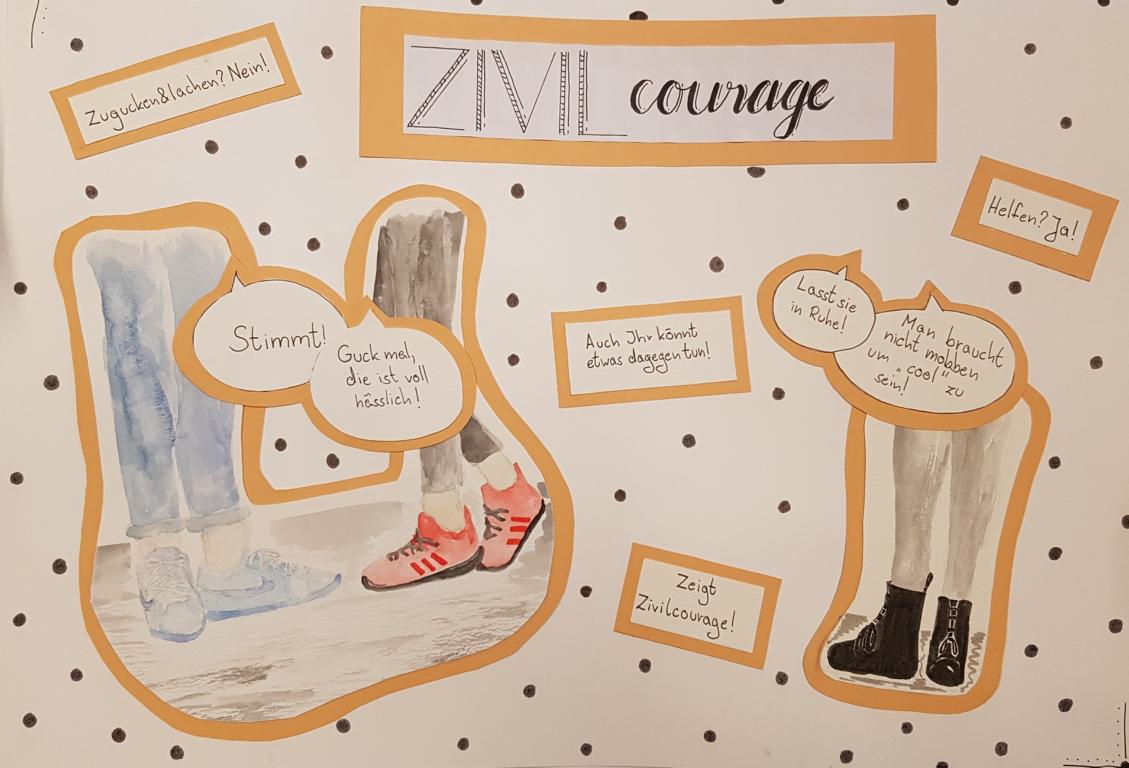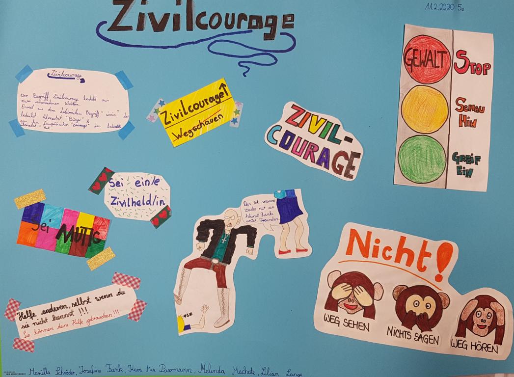 In den Jahrgängen 7 und 8 kommen externe Referenten zum Einsatz und gestalteten jeweils einen sechsstündigen Kurs zum Thema Zivilcourage. Und in den Jahrgängen 9 und E wird z.B. ein zuvor gemeinsam geschauter Film zusammen mit der Klassenleitung besprochen und dabei auch allgemein der Bezug zur Zivilcourage hergestellt.